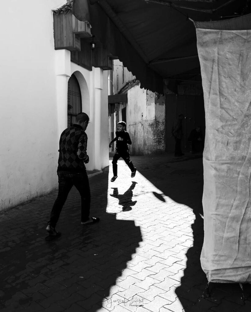 One of his most cherished photographs was taken in the Moroccan town of Sefrou. At midday, Youssef noticed how the sun cut the street in two, creating a stark boundary between light and shadow. For half an hour, he stood there, waiting — not forcing, not rushing, but allowing the street to gift him its story.