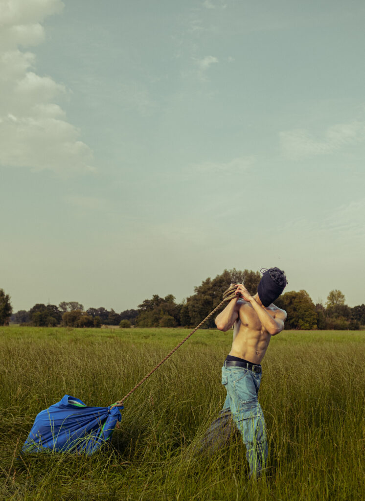 Among the many powerful works in his portfolio, one image stands out as particularly personal to him: a masked man pulling a heavy weight behind him.