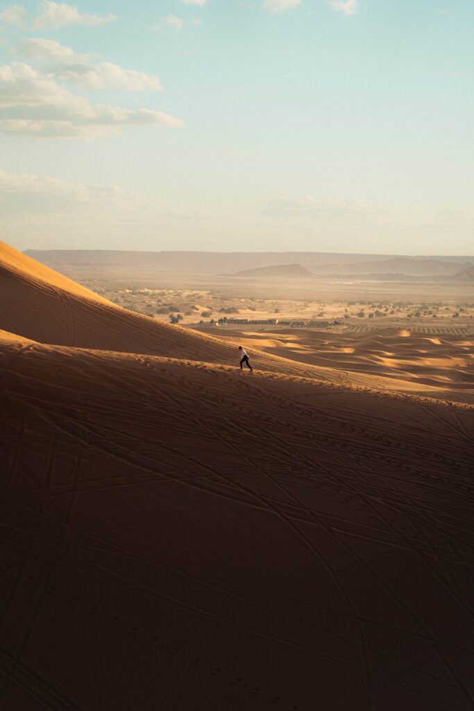 Among his many photographs, one moment in the desert remains etched in his memory. “I had just climbed to the top of a dune, and when I reached the peak, another dune rose in front of me. On its ridge, a lone person was walking, framed perfectly by the vastness of the sand and sky. The scene felt surreal, almost like a movie. I instinctively grabbed my camera and captured the moment—simple, pure, and unforgettable.” This story is not only about a photograph but about the philosophy of Ettalbi’s craft: to capture fleeting instants that hold timeless meaning.
