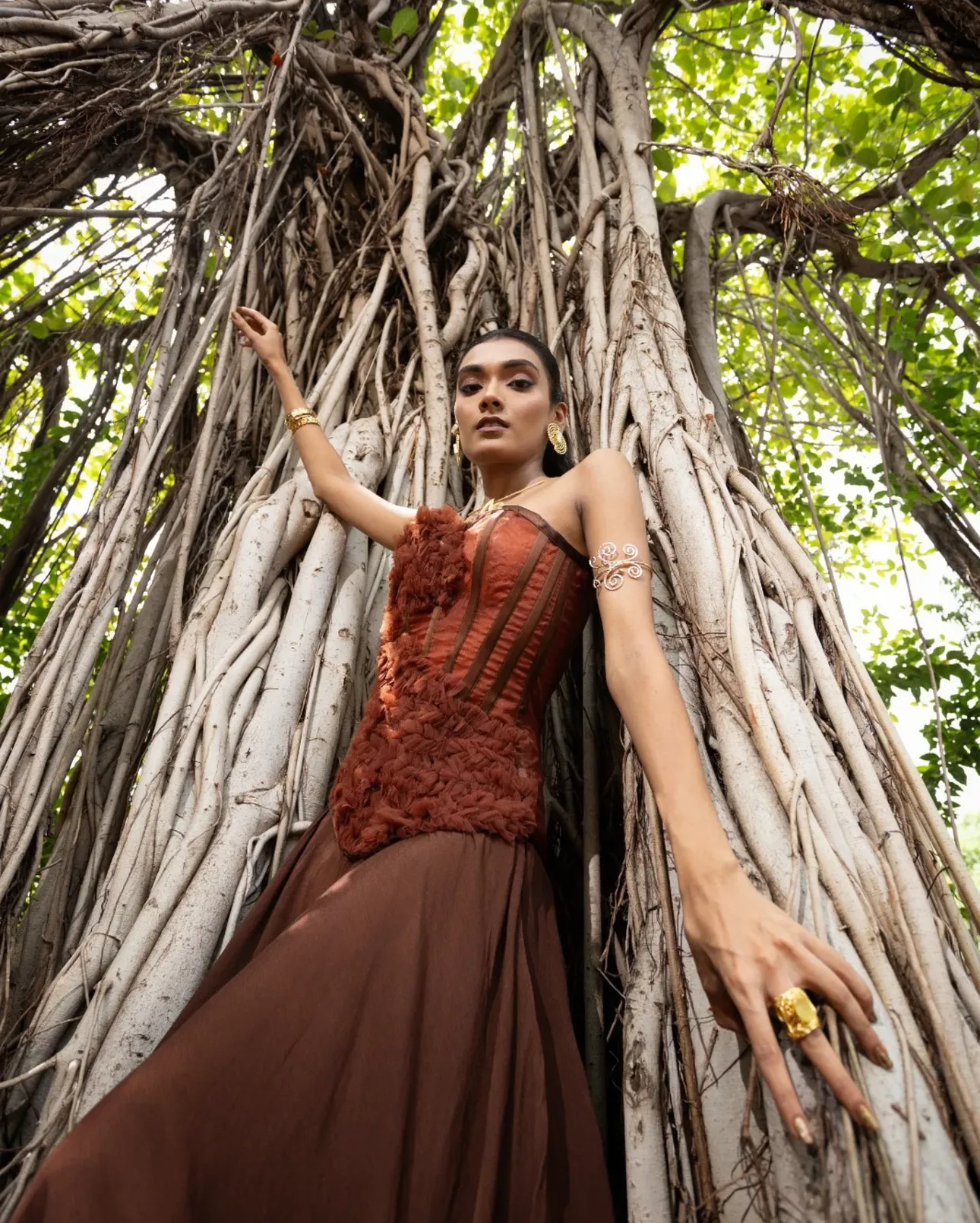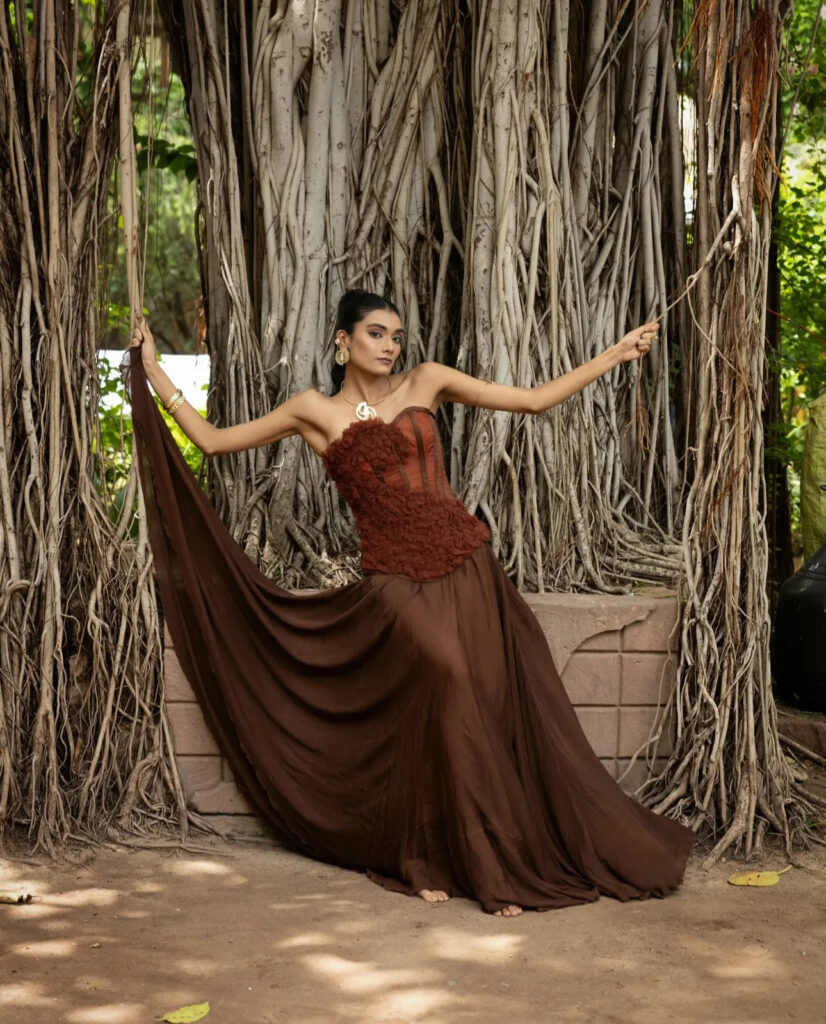 Tanvi’s latest body of work is a tribute to landscape and spirit. “Each look became a wearable landscape,” she shares. “An ode to nature’s architecture and feminine strength.” You don’t just wear her designs — you enter them. They hold space for the wild within, the ancestral memory, and the calm clarity of self-awareness.